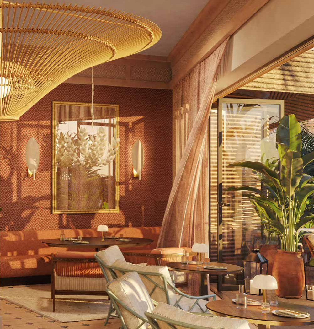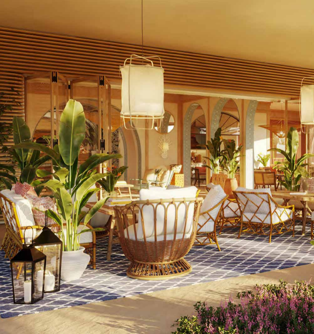內飾以海洋與沙粒的天然色調為基底,幾何裝飾元素暗藏阿拉伯文化的密碼,傳統(tǒng)陶器、圖騰地毯與匠人壁飾點綴其間。