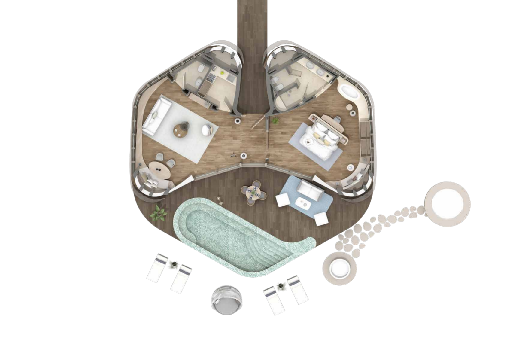 63棟隱世別墅以貝殼的靈感構建,或棲于白色沙灘,或浮于蔚藍海面,每一棟都是與自然共生的私密天地。
