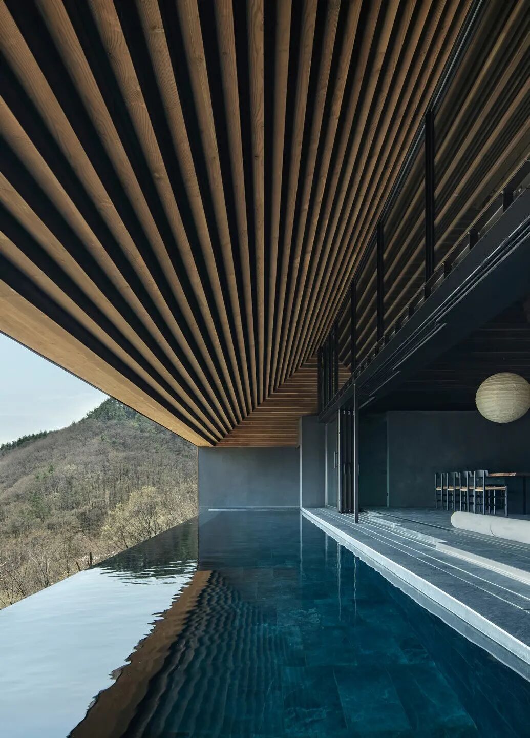5米無(wú)邊際泳池如凝固瀑布,與河谷水平線呼應(yīng),游弋仿若云端滑行。池底做舊石材映照天光,水成天空與建筑的液態(tài)紐帶。