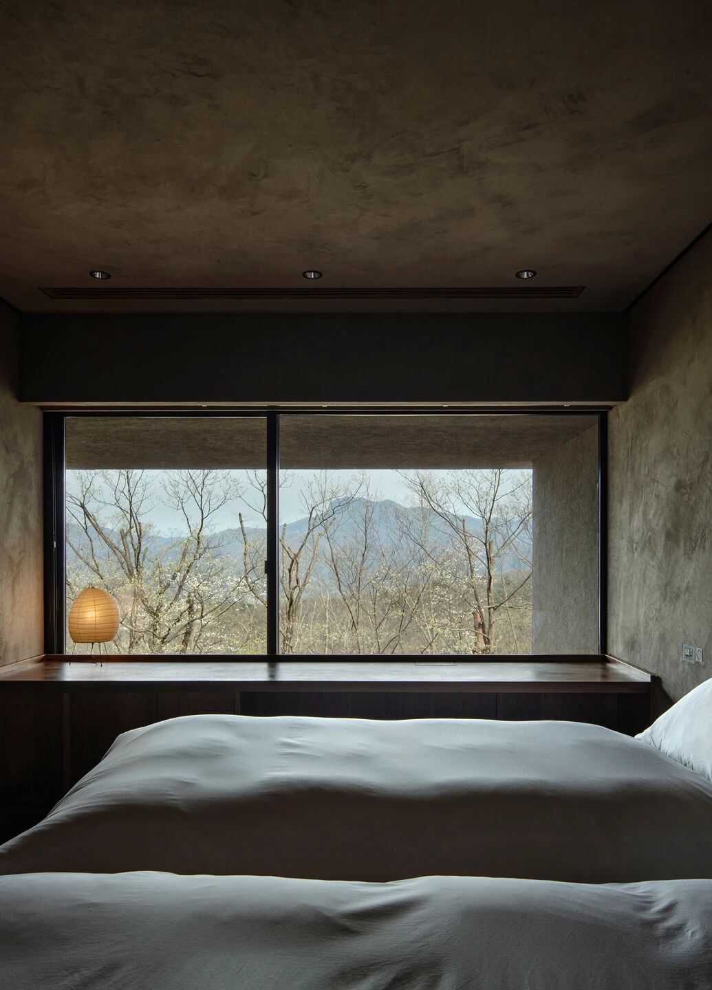 矩形大窗框住林間光影,榻榻米與灰泥墻面交織侘寂氛圍。