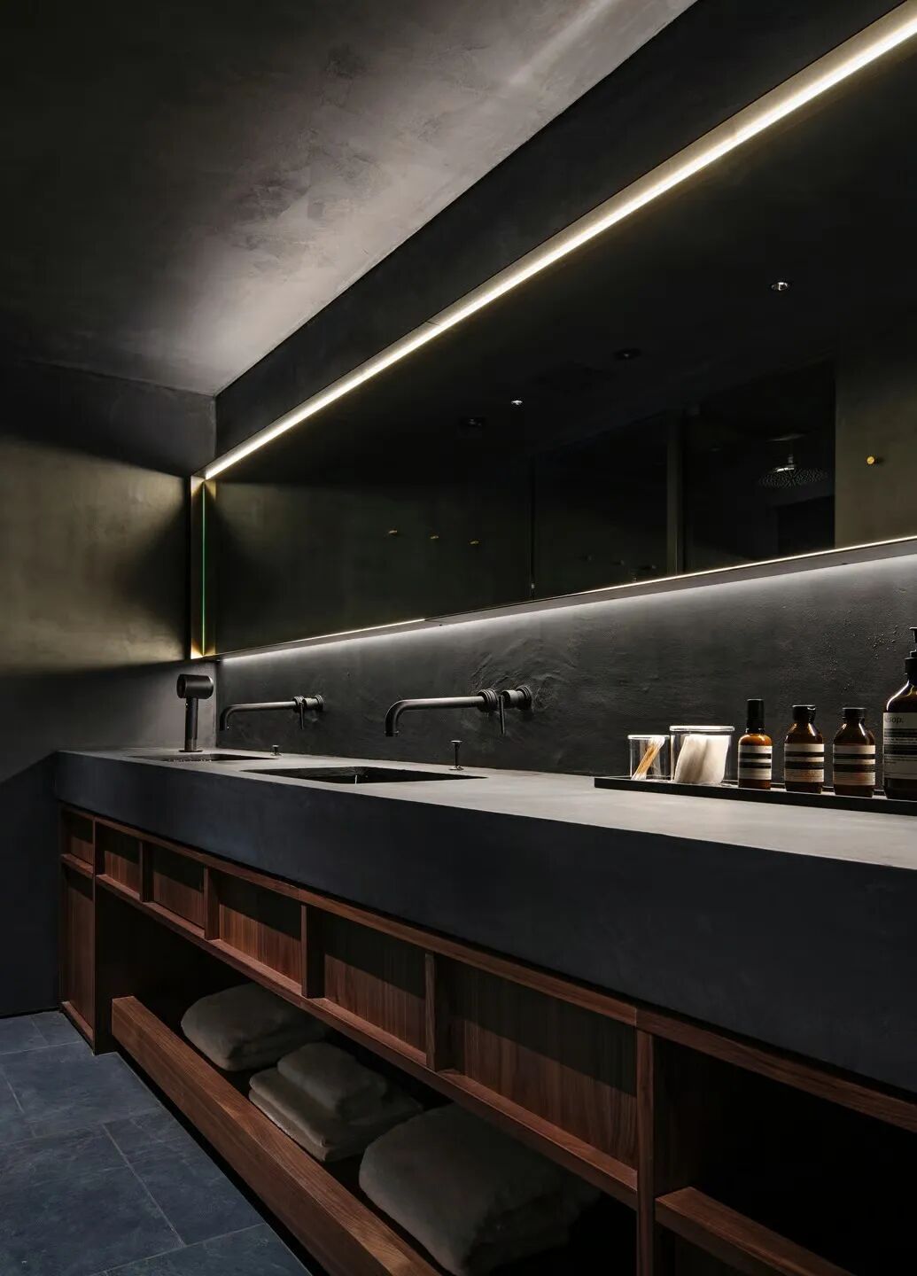 浴室深木色與灰泥營(yíng)造沉靜,一體化臺(tái)面和線性照明延伸視覺(jué)。