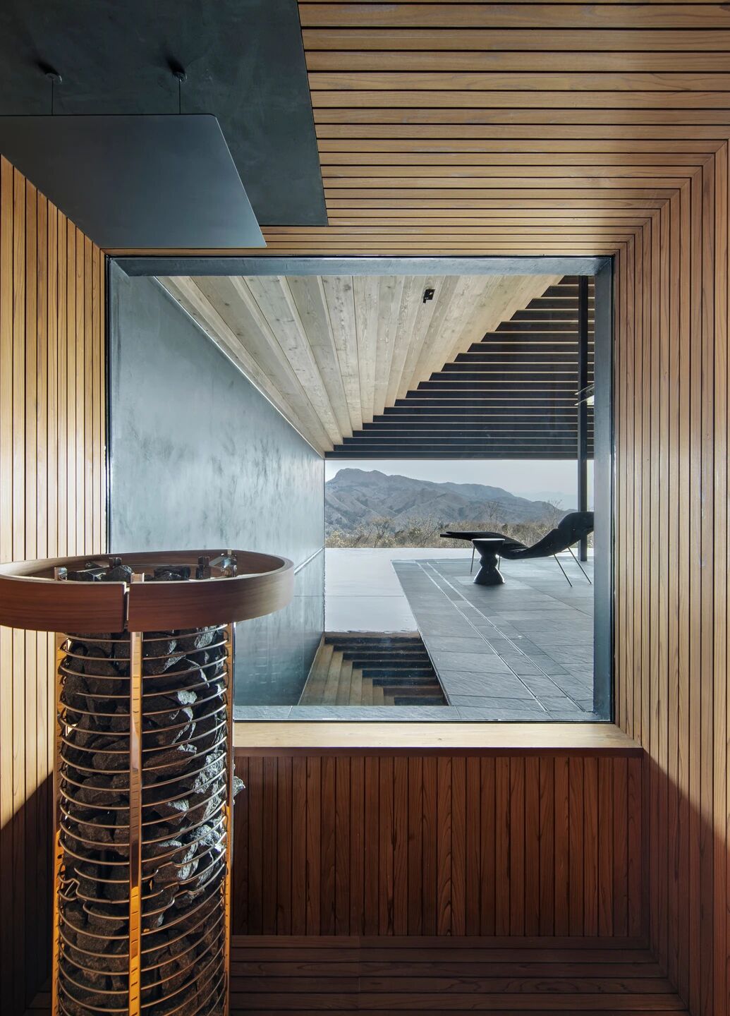 桑拿房木香縈繞,方窗框住山谷景致,療愈與自然同在。